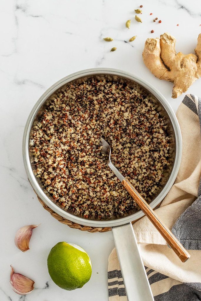 - Abre el cazo y rasca la quinoa con un tenedor para dejarla bien suelta. Tienes que ver que los granos hayan duplicado su volumen y estén transparentes.