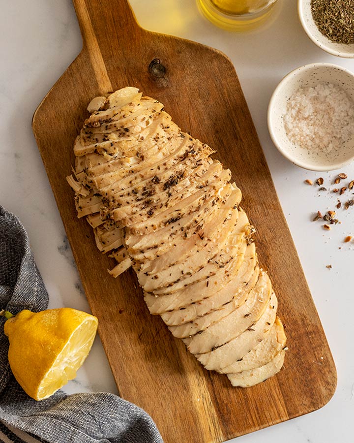 - Pasa la pechuga a una tabla, deja enfriar y córtala en lonchas finas.