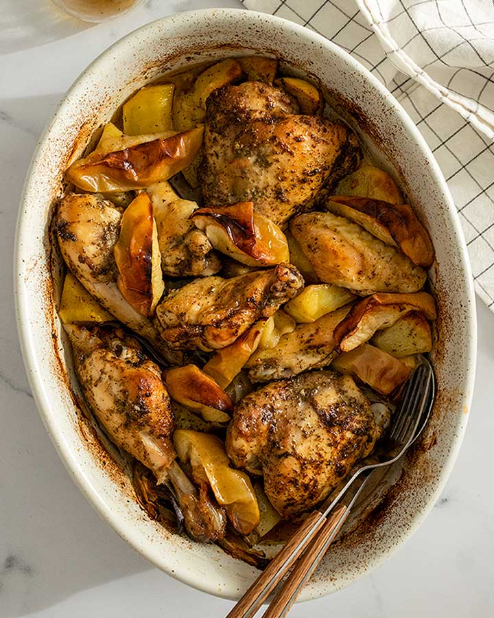 Para este plato de pollo asado al Airfryer o a la freidora de aire voy a compartirte un adobo que hace que el pollo quede jugoso y con mucho sabor. Va acompañado también de patatas y manzana que le queda estupendo a esta combinación. También te dejo indicaciones para hacerlo al horno.