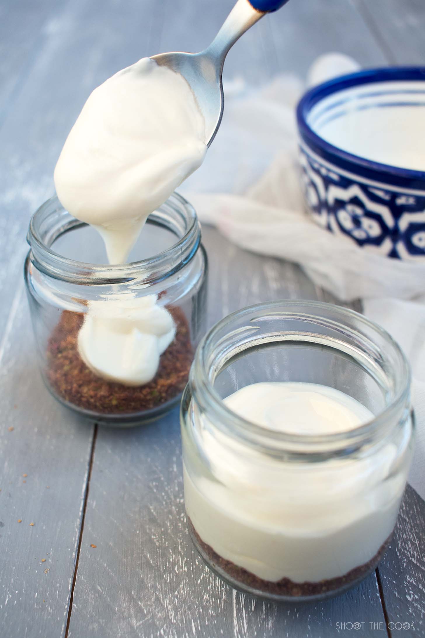 Echa en los dos vasitos, añade suficiente cantidad para crear una base de unos 5-8 mm. Aplasta la galleta con la cuchara o con los dedos hasta que quede compacta. Reservar en el frigorífico.